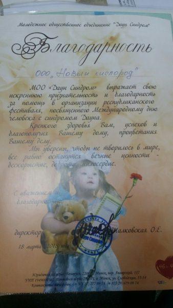 ООО “Новый кислород” оказал помощь в организации Фестиваля к Международному дню поддержки человека с синдромом Дауна. Фестиваль прошел 18 марта во Дворце детей и молодежи, и мы были рады оказать посильную помощь организаторуФестиваля – МОО “Даун Синдром”.