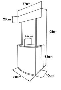 Компактный прилавок с закругленной фронтальной частью. Рекламное изображение может быть сменным. Столешница, основание и внутренняя полка из жесткого формованного пластика.
