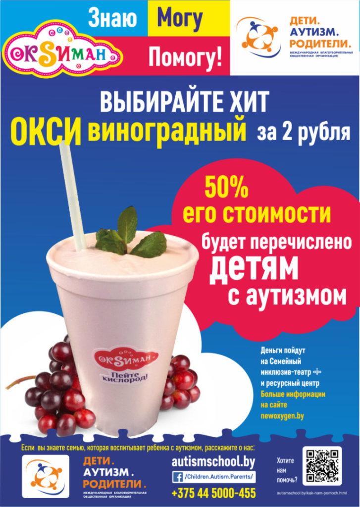 …и не только ОКСИМАН – но и вы можете самым легким и вкусным способом помочь детям с аутизмом! Каждый раз когда вы покупаете коктейль ОКСИ виноградный, вы помогаете детям с аутизмом!
